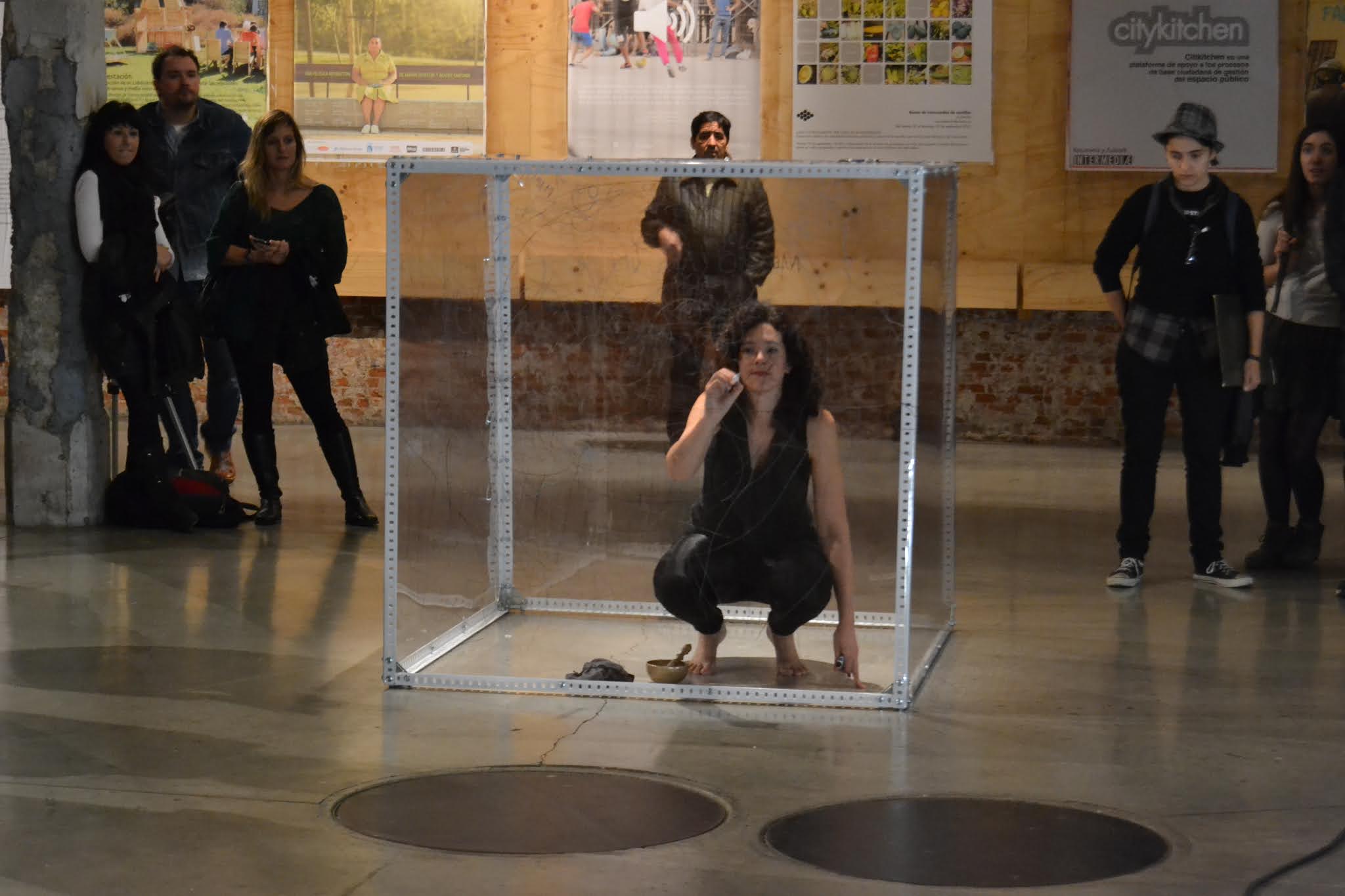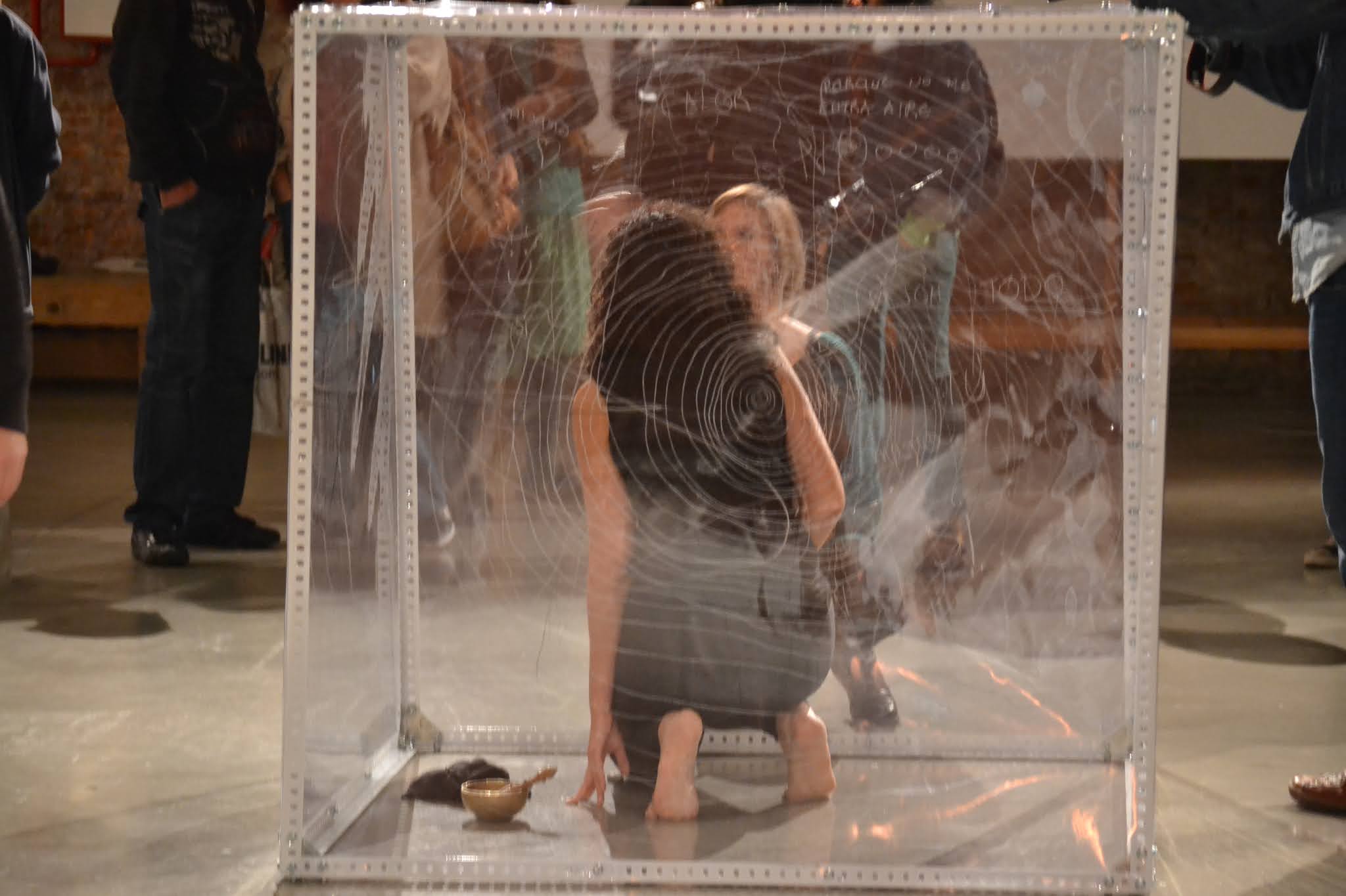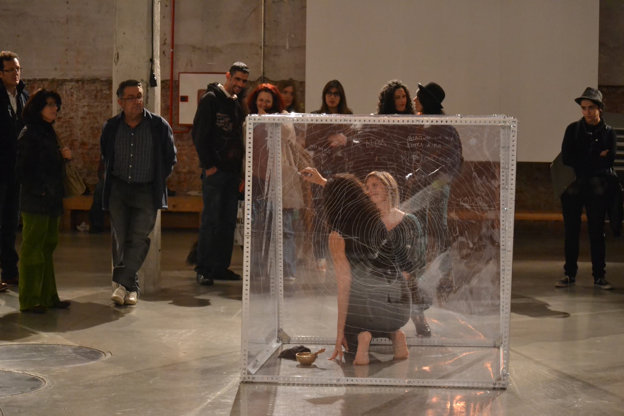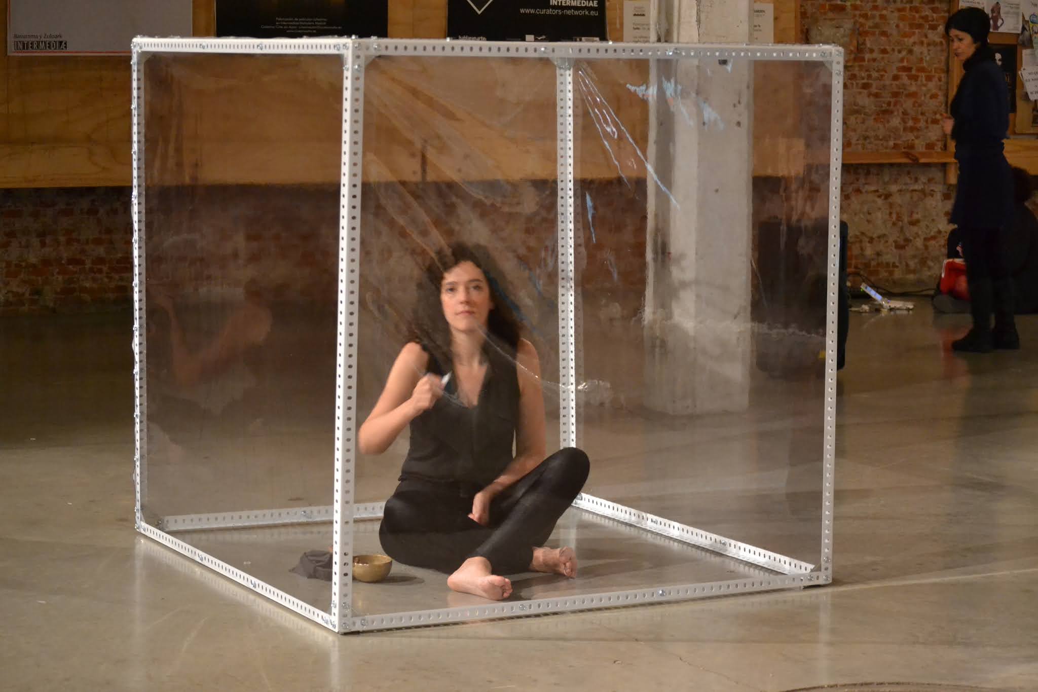 El espacio interior se saca fuera y se hace visible, focalizando la atención en el espacio que habita entre los espacios, aquél que pasa desapercibido. Una reflexión que se convierte en vital y me lleva a una búsqueda de esos lugares y lo que habita en ellos. La instalación-performance se convierte así en la representación de ese proceso, como una cartografía tridimensional. El espacio queda delimitado a un cubo transparente de 120 x 120 x 120 cm. Desde dentro voy escribiendo los pensamientos que van surgiendo durante varias horas. Se establece una comunicación con el público, con el filtro del plástico como límite casi orgánico, límite también del propio cuerpo. Y la lectura al revés, reflejando lo complicado que resulta a veces hacernos entender y entender a los demás. El intercambio de pensamientos es tan complicado algunas veces que es como si cada uno escribiera en idiomas diferentes. Para hacerse entender sólo hay que ponerse en el lugar del otro y así leerlo fácilmente.