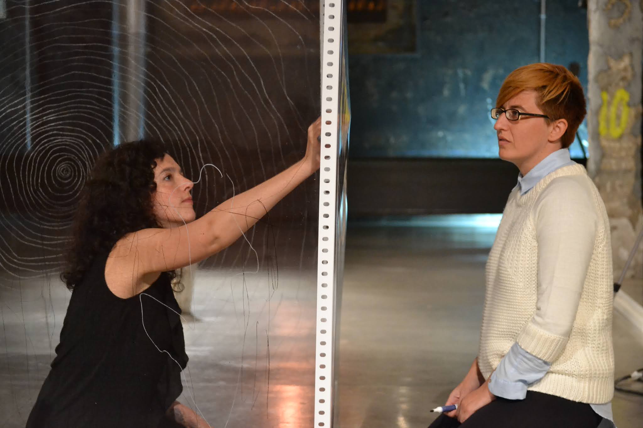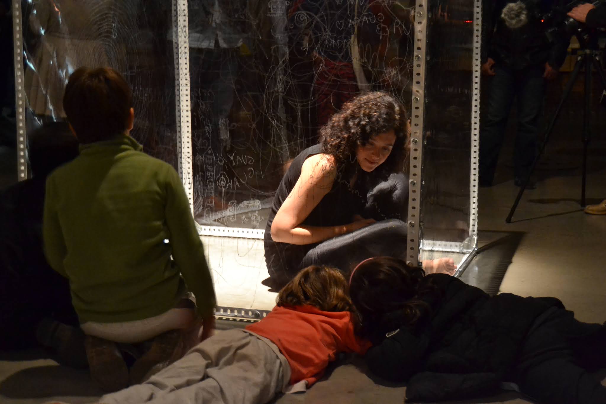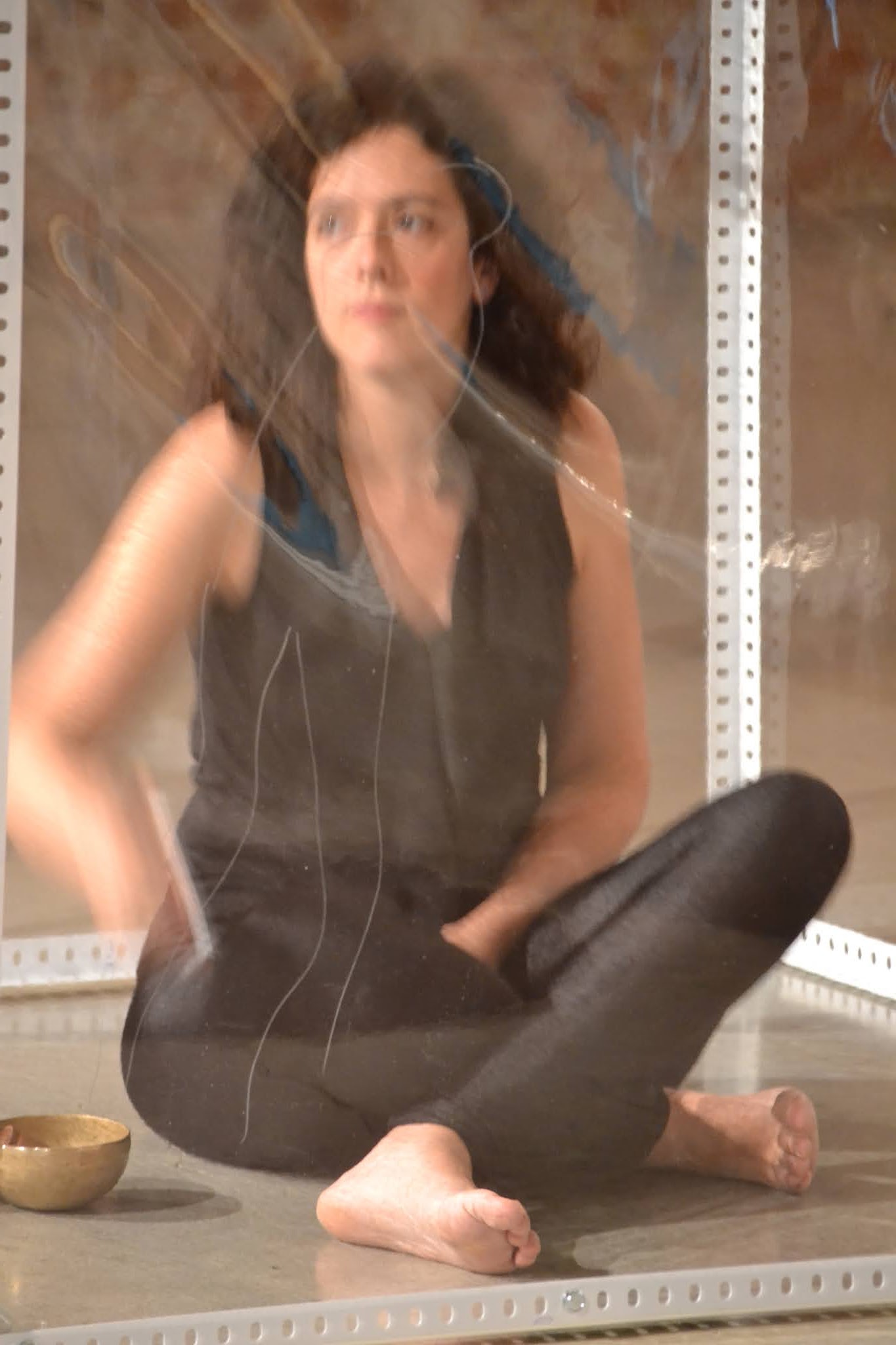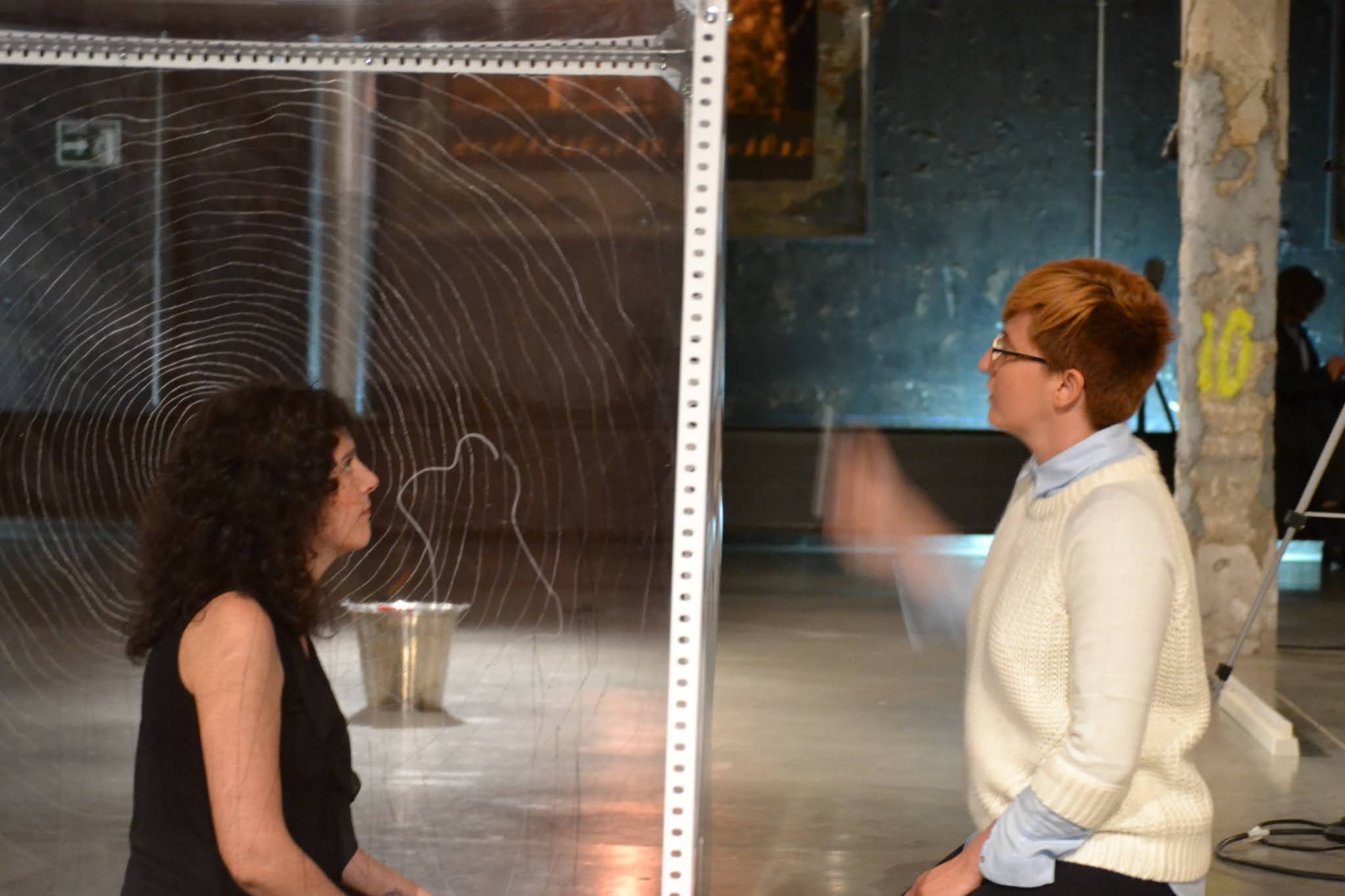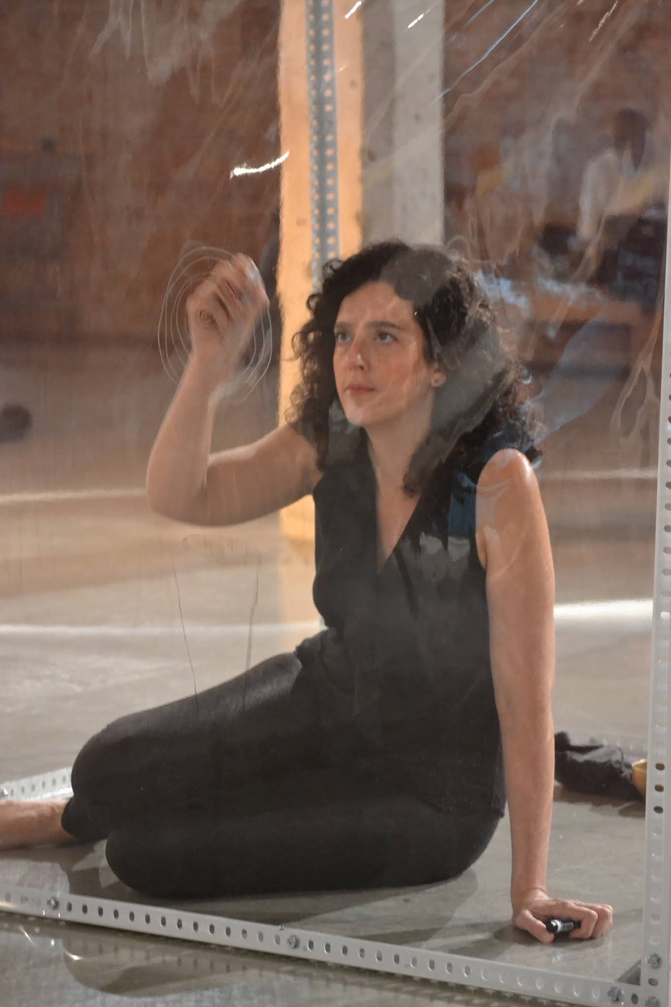 El espacio interior se saca fuera y se hace visible, focalizando la atención en el espacio que habita entre los espacios, aquél que pasa desapercibido. Una reflexión que se convierte en vital y me lleva a una búsqueda de esos lugares y lo que habita en ellos. La instalación-performance se convierte así en la representación de ese proceso, como una cartografía tridimensional. El espacio queda delimitado a un cubo transparente de 120 x 120 x 120 cm. Desde dentro voy escribiendo los pensamientos que van surgiendo durante varias horas. Se establece una comunicación con el público, con el filtro del plástico como límite casi orgánico, límite también del propio cuerpo. Y la lectura al revés, reflejando lo complicado que resulta a veces hacernos entender y entender a los demás. El intercambio de pensamientos es tan complicado algunas veces que es como si cada uno escribiera en idiomas diferentes. Para hacerse entender sólo hay que ponerse en el lugar del otro y así leerlo fácilmente.