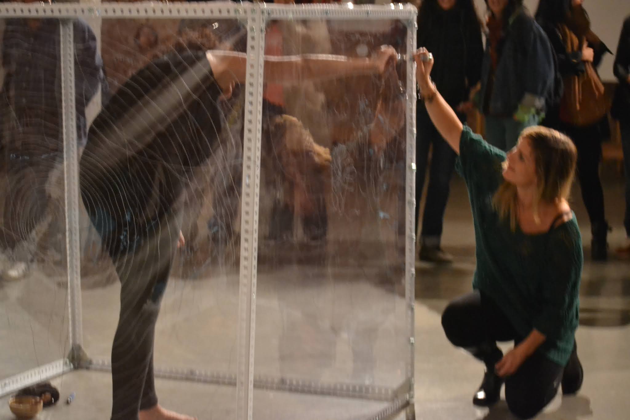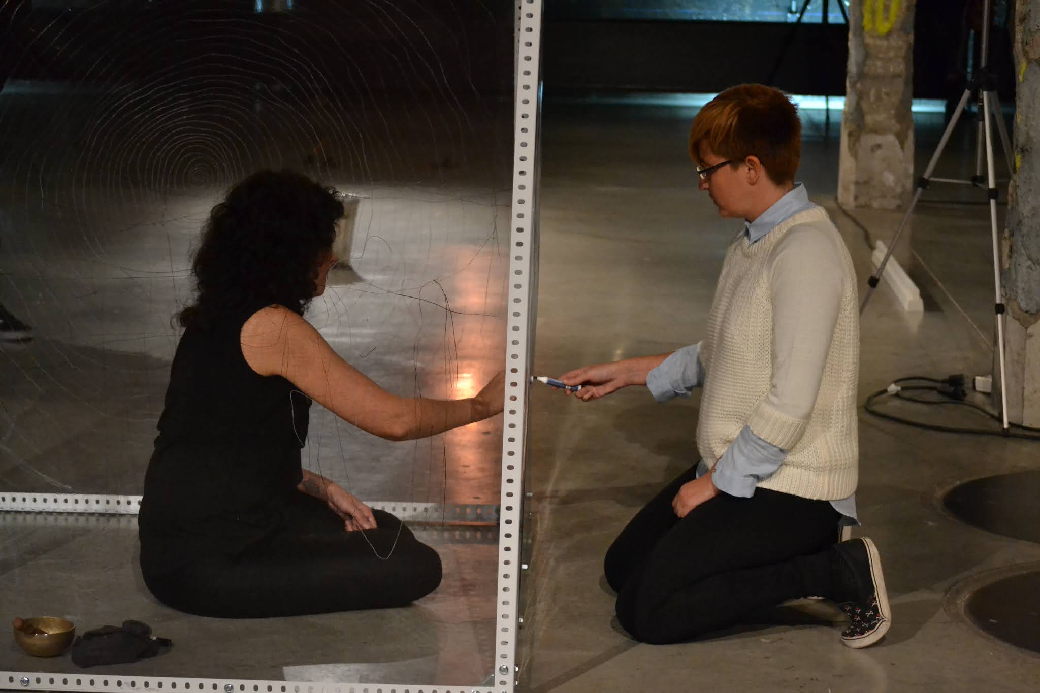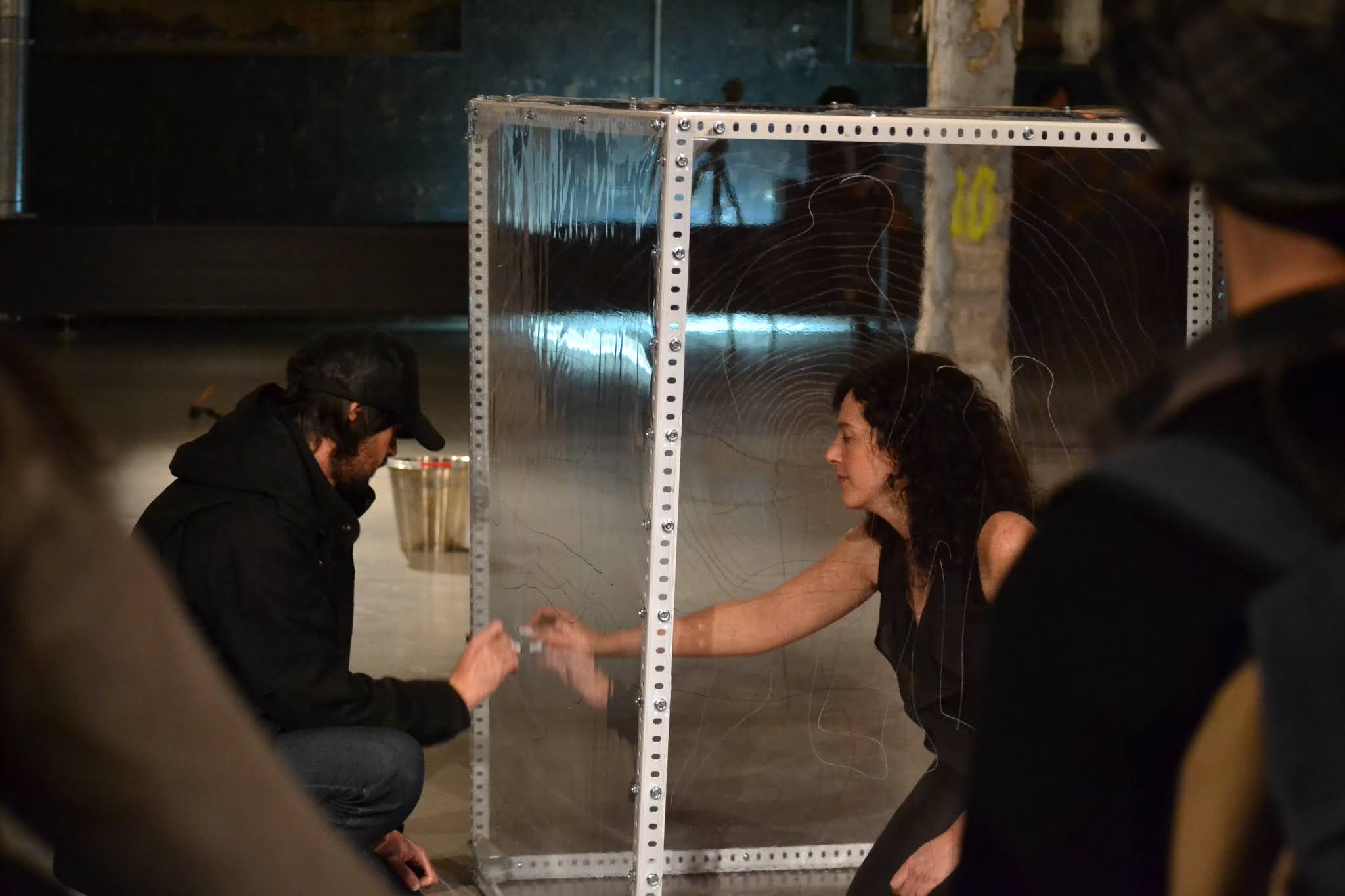 Una membrana transparente que separa a las personas. Podemos vernos, pero ¿cómo sentirnos? La comunicación se limita a una escritura y lectura que se lee al revés. En el desarrollo de la performance, las barreras parecían diluirse, como si nada nos impidiera sentirnos. La comunicación, conexión y el amor, iban más allá del tiempo y el espacio.