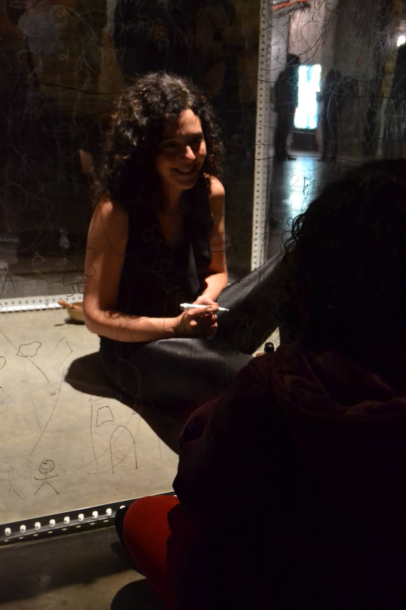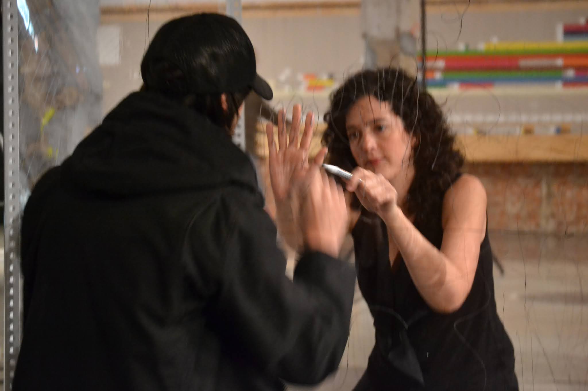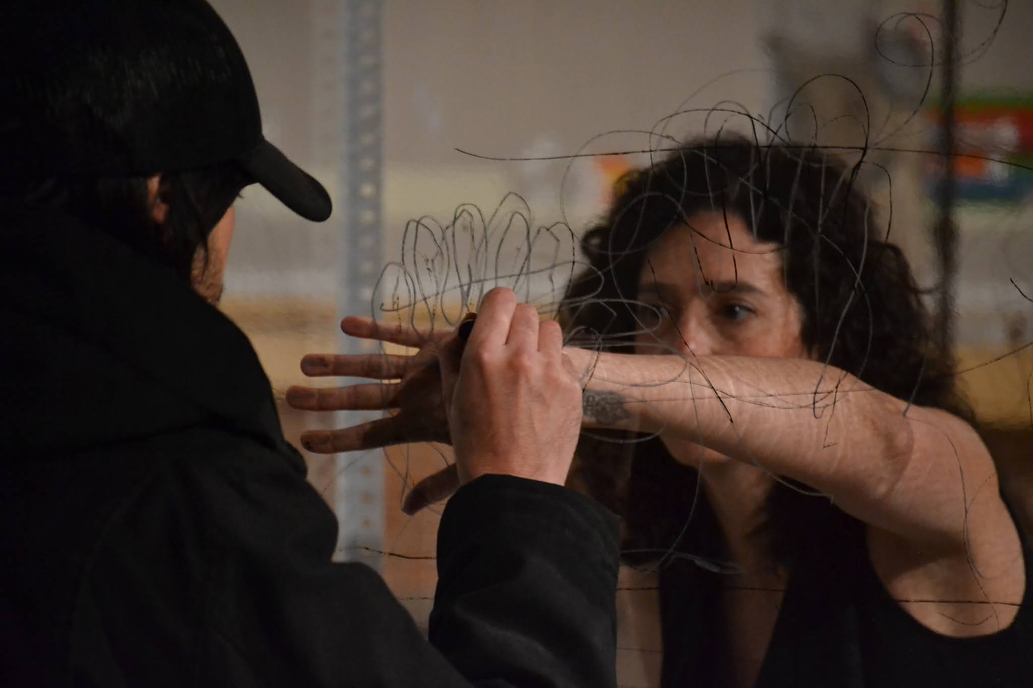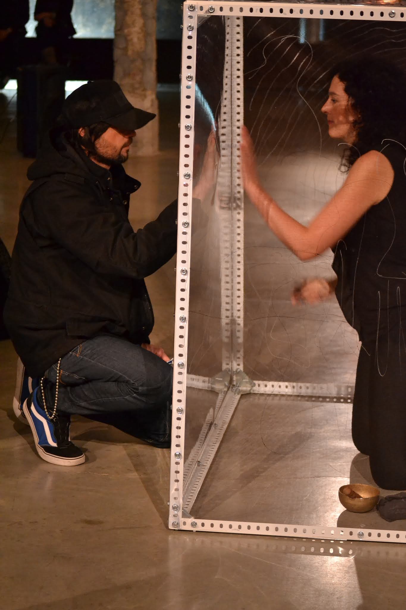 Una membrana transparente que separa a las personas. Podemos vernos, pero ¿cómo sentirnos? La comunicación se limita a una escritura y lectura que se lee al revés. En el desarrollo de la performance, las barreras parecían diluirse, como si nada nos impidiera sentirnos. La comunicación, conexión y el amor, iban más allá del tiempo y el espacio.